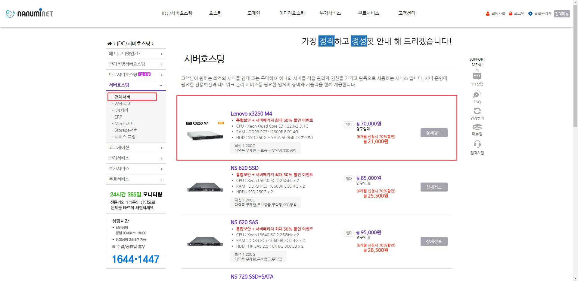 2. 아래 그림처럼 IDC/서버호스팅메뉴에서=>전체서버=>Lenovo x3250 M4 선택