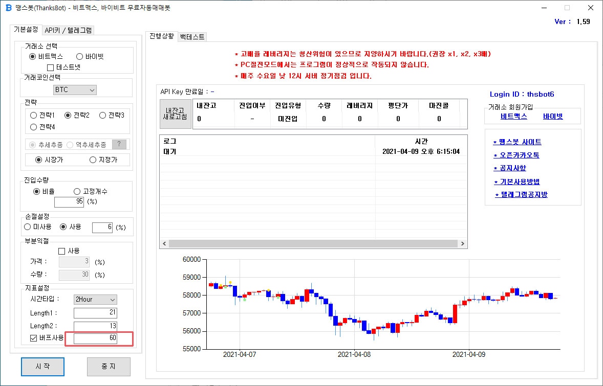 예를들어 해당 땡스봇 박스란에 60을 적용한후 내포지션이 50000만달러에 롱을 잡았는데 6만달러를 찍고 54000