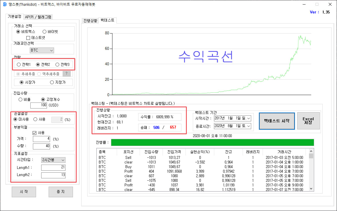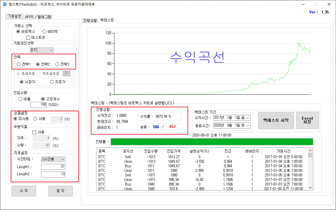 기본설정1 : 시간타입 :2시간봉, Length1 : 21, Length2 : 13,손절미사용,부분익절사용 (가격4%,수량40%)
