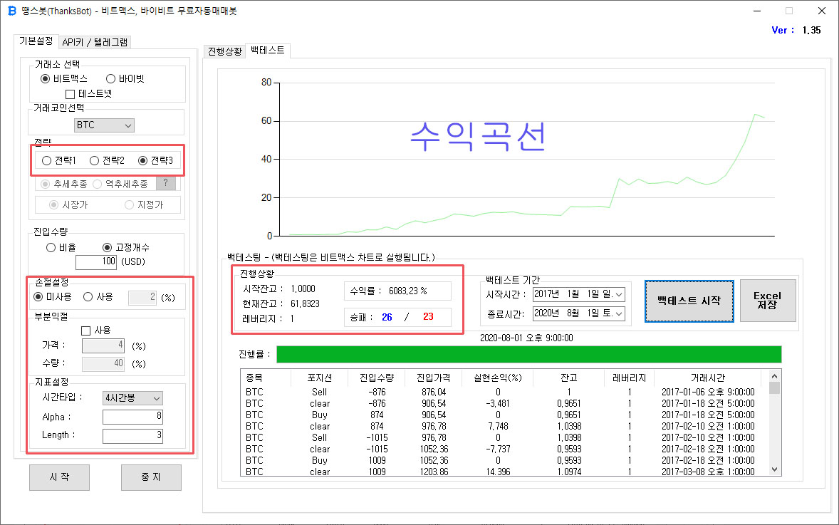 레버리지1배기준이며, 설정값은 4시간봉, Alpah8, Length3입니다.