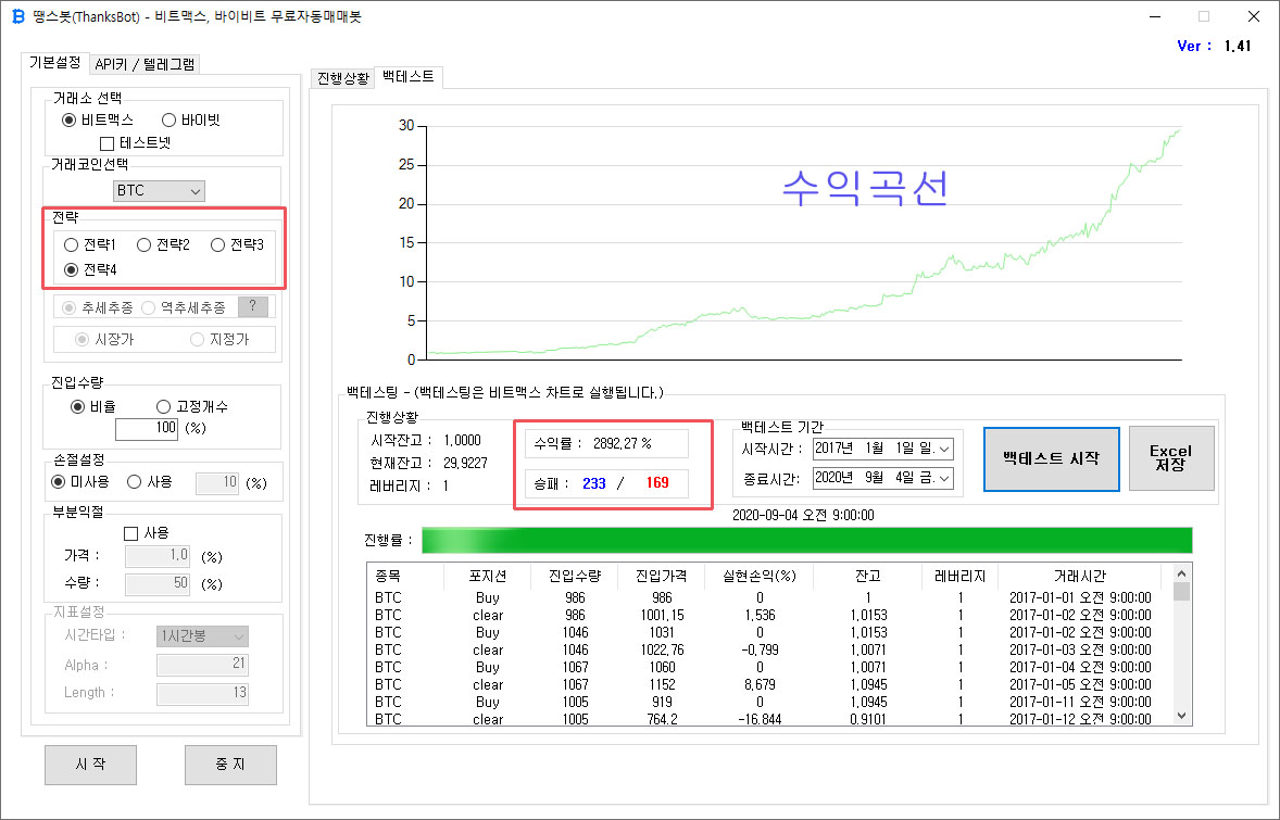 위에 백테스트 결과를 보시면 아시겠지만 2017.1.1 ~ 2020.9월4일까지 총 수익률이 2892%정도 나오네요