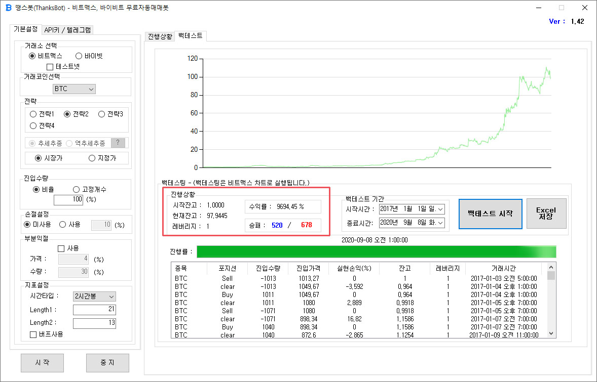 아래 이미지는 2017.1.1 ~ 2020.9.8 백테스트 결과입니다.