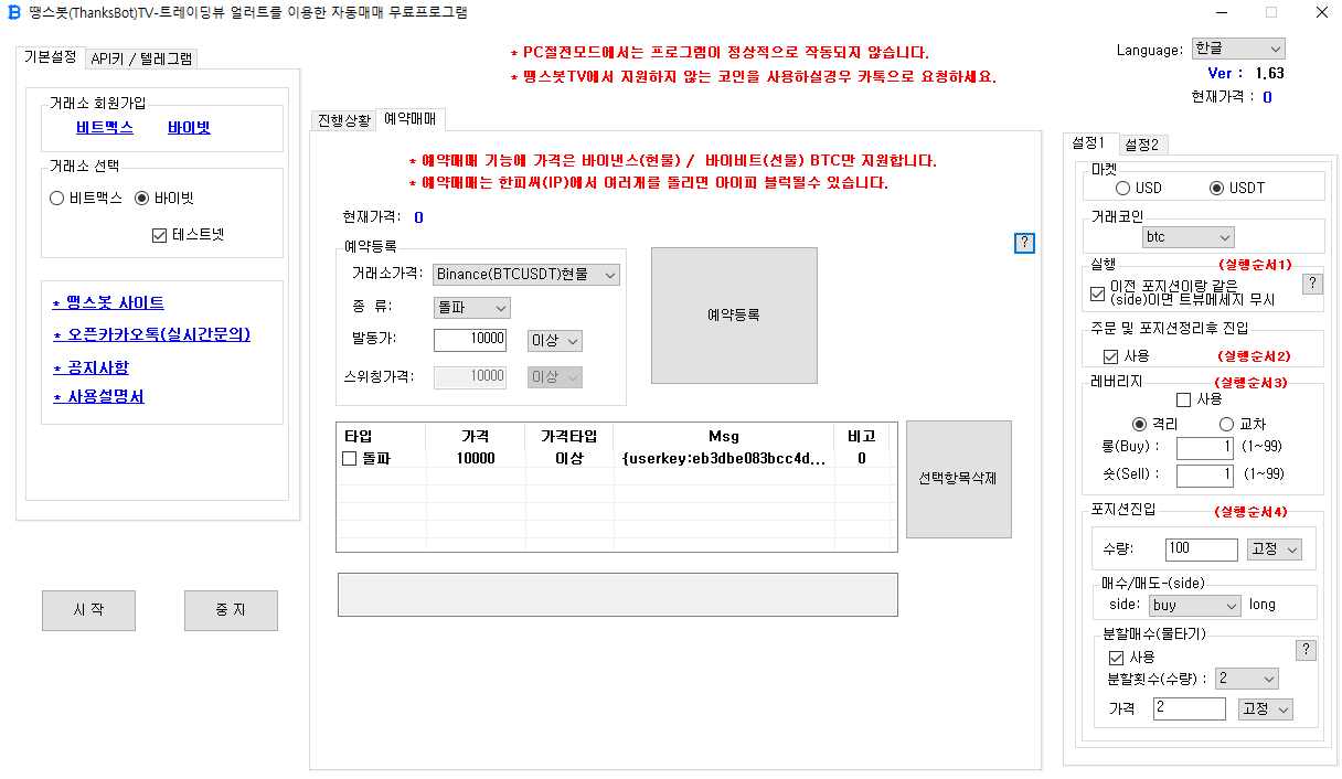 - 예약매매 기능은 트레이딩뷰 연동없이 땡스봇TV 독자적으로 실행됩니다.